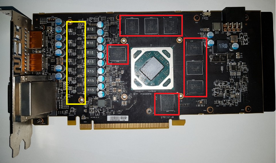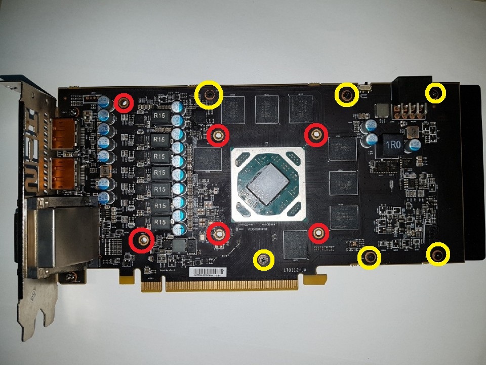 그래픽카드 후면에서 6개 나사(빨강)를 풀면 방열판과 쿨러를 분리할 수 있고