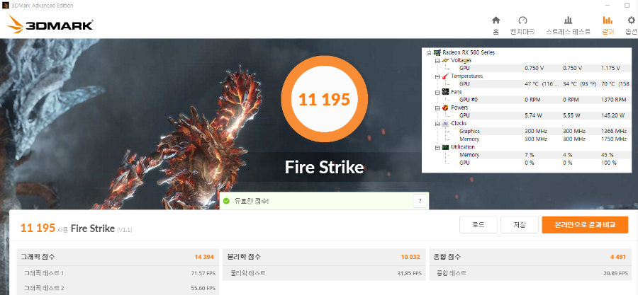풀로드 온도 70도, 그래픽 점수도 준수한 상태를 보여줬습니다.