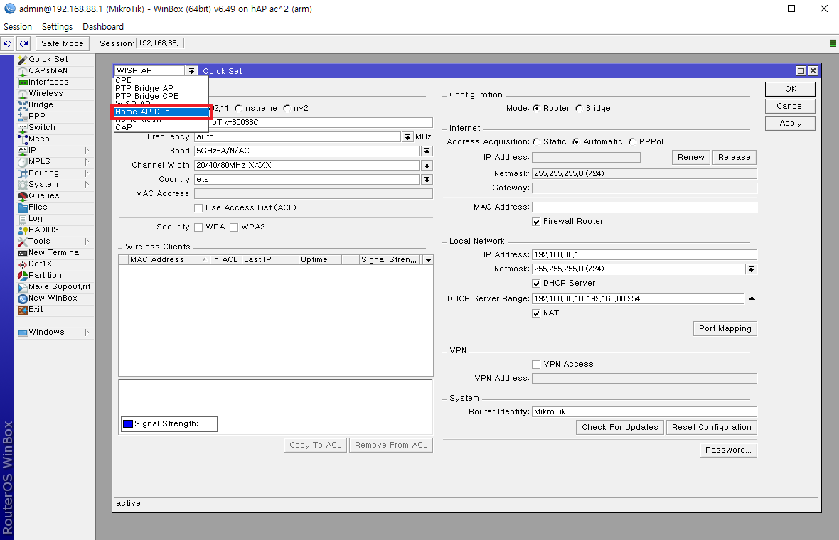 상단에 WISP AP 라고 되어있는 부분을 클릭하여 Home AP Dual 을 선택합니다.