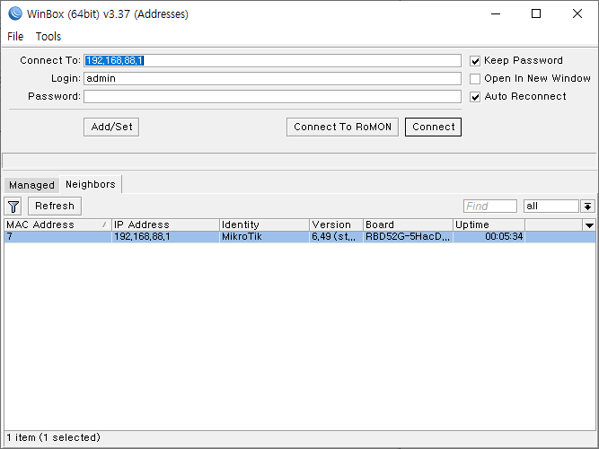 라우터에 랜선을 연결 한 후 winbox 프로그램을 실행한 뒤